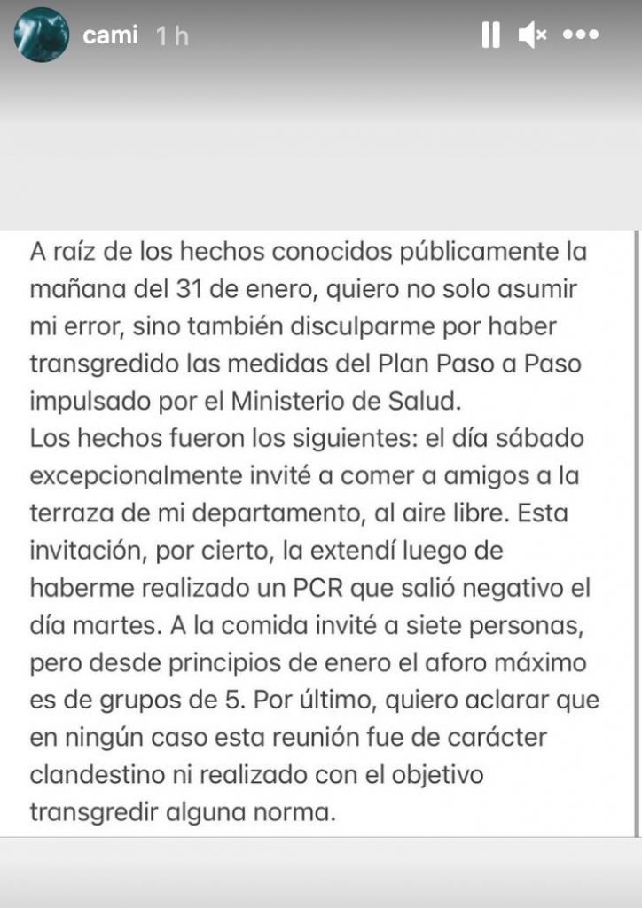 "A raíz de los hechos conocidos públicamente la mañana del 31 de enero, quiero no solo asumir mi error, sino también disculparme por haber transgredido las medidas del Plan Paso a Paso impulsado por el Ministerio de Salud", escribió Cami en su Instagram.