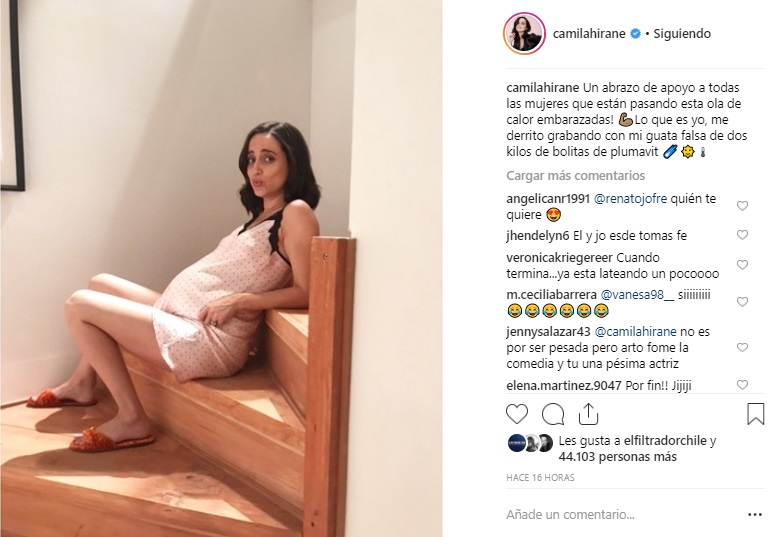 "Un abrazo de apoyo a todas las mujeres que están pasando esta ola de calor embarazadas! Lo que es yo, me derrito grabando con mi guata falsa de dos kilos de bolitas de plumavit", escribió Camila en su cuenta de Instagram.