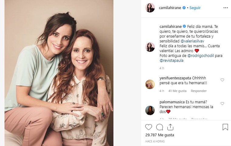"Feliz día mamá. Te quiero, te quiero, te quiero! Gracias por enseñarme de tu fortaleza y sensibilidad @valeriasilvavFeliz día a todas las mamis... Cuanta valentía! Las admiro", escribió Camila.