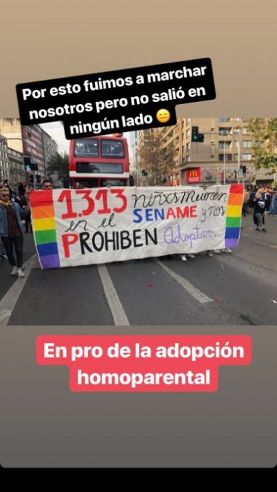 Pero a pesar de la alta cobertura que se le dio a la convocatoria, Camila criticó que se hayan enfocado mucho más en quiénes asistían, en vez de los motivos de fondo. "Por esto fuimos a marchar nosotros pero no salió en ningún lado. En pro de la adopción homoparental.", escribió la ex Miss Chile en sus historias de Instagram.