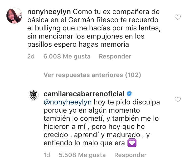 Rápidamente Recabarren respondió a este comentario y pidió disculpas por su actuar. “Hoy te pido disculpas porque yo en algún momento también lo cometí (bullying) y también me lo hicieron a mí. Pero hoy que he crecido, aprendí y madurado, y entiendo lo malo que era”, escribió.