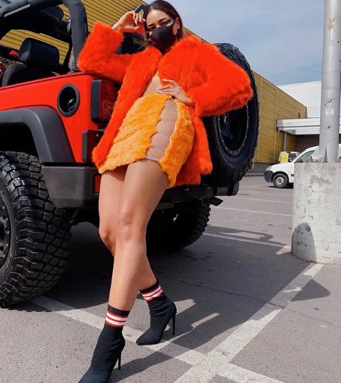 "Yapo con mascarilla ! 😷 pero lo damos todo si no Pa ke 😜pa pasar piola 🤭", escribió la ex "Miss Chile" junto a la foto donde muestra su atuendo fashionista. Este consiste en una extravagante falda y chaqueta 'peludas' en tonos naranjo, zapatos con tacones y una mascarilla negra.