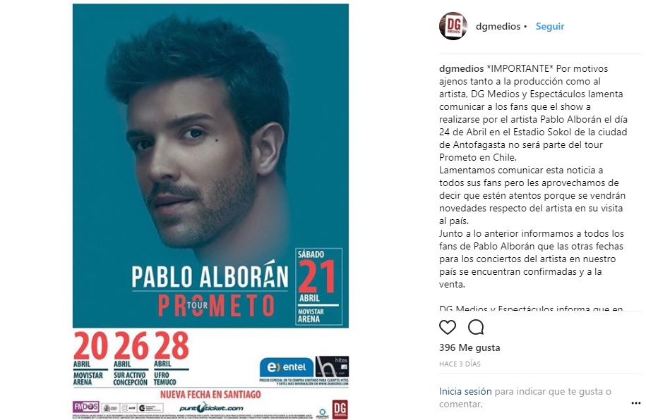 "Por motivos ajenos tanto a la producción como al artista, DG Medios y Espectáculos lamenta comunicar a los fans que el show a realizarse por el artista Pablo Alborán el día 24 de Abril en el Estadio Sokol de la ciudad de Antofagasta no será parte del tour Prometo en Chile. Lamentamos comunicar esta noticia a todos sus fans pero les aprovechamos de decir que estén atentos porque se vendrán novedades respecto del artista en su visita al país. Junto a lo anterior informamos a todos los fans de Pablo Alborán que las otras fechas para los conciertos del artista en nuestro país se encuentran confirmadas y a la venta", detallaron en DG Medios.