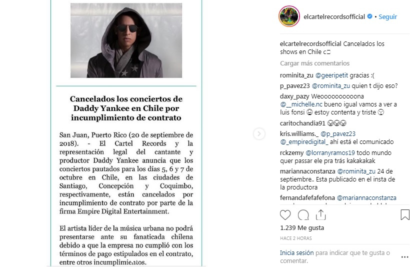A través de un comunicado, Cartel Records, la productora de Daddy Yankee anunció "incumplimiento de contrato por parte de la firma Empire Digital Entertainment". De acuerdo a Cartel Records, la empresa "no cumplió con los términos de pago estipulados en el contrato, entre otros incumplimientos". Asimismo, revelaron que la "productora anunció un tercer concierto del artista para Concepción, Chile que estaba sujeto a unas cláusulas económicas que tampoco se cumplieron".