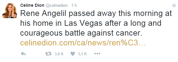“Rene Angelil falleció esta mañana en su casa en las vegas después de una larga y valiente batalla contra el cáncer. La familia pide que se respete su privacidad. Más detalles serán proporcionados en otro momento”