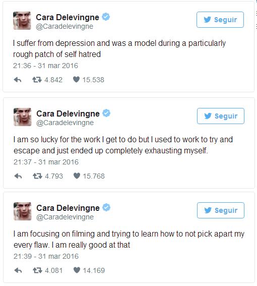 La modelo y actriz se enteró de los malos comentarios por parte de la gente a través de redes sociales y realizó la siguiente confesión en su cuenta oficial de Twitter: "No culpo a la industria de la moda de nada. Sufro de depresión y fui una modelo en una época particularmente complicada de odio a mí misma". Estas palabras no solo sorprendieron a sus seguidores, sino también a los medios de comunicación, quienes de inmediato comenzaron a hablar del estado de Cara.
