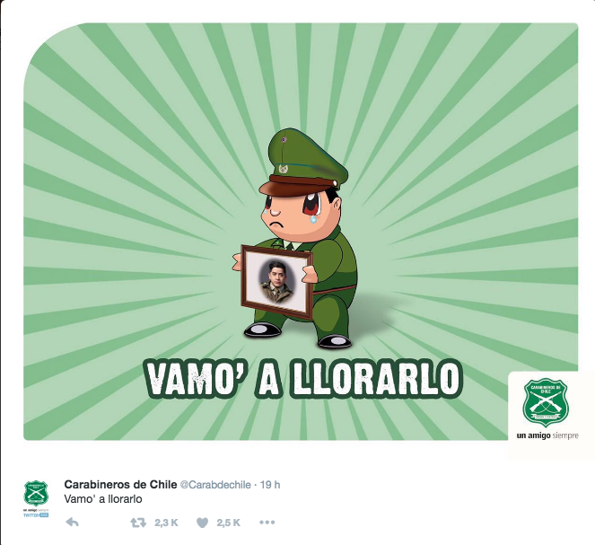 Ahora, a propósito de la triste muerte del Cabo Railef Huaiquimil (Fernando Godoy) de la teleserie "Pobre gallo", la institución expresó su tristeza por este acontecimiento, acompañando el mensaje con el popular meme del Pokemón "Squirtle".