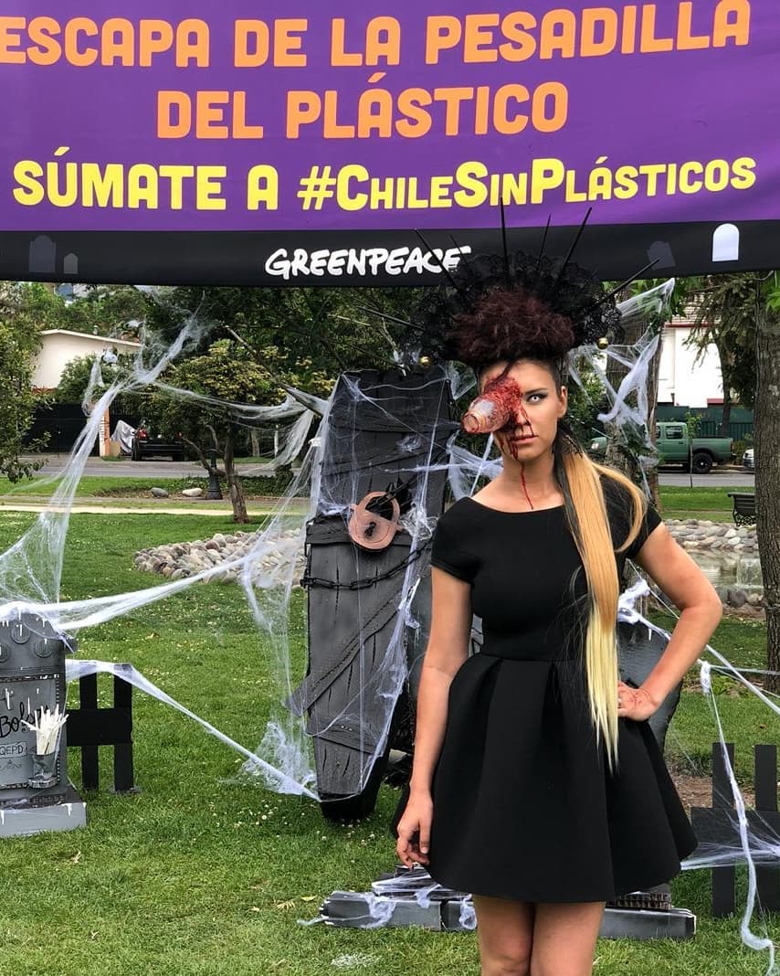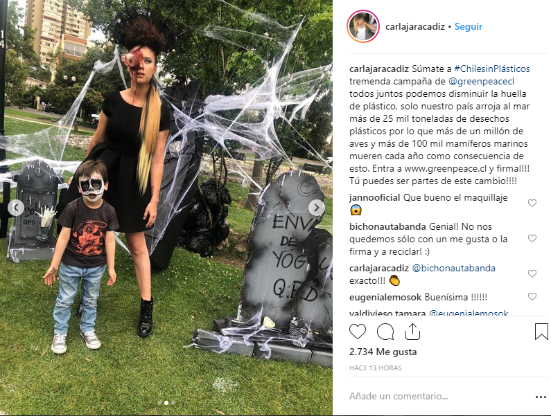 Y es que la ex "Mekano" sorprendió a los transeúntes de un parque de Providencia vestida de zombie, pero no como cualquier zombie, sino uno muy preocupado por el medioambiente. Con un vestido negro, botines, maquillada con sangre falsa y una gran botella de plástica saliendo de uno de sus ojos, Carla entregó dulces a los niños que pasaban por ahí.