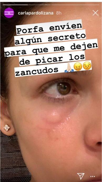 En sus historias de Instagram Carla compartió fotos donde se ve que el zancudo la picó en la parte baja de uno de sus ojos. "Porfa envíen algún secreto para que me dejen de picar los zancudos", escribió en uno de los registros.