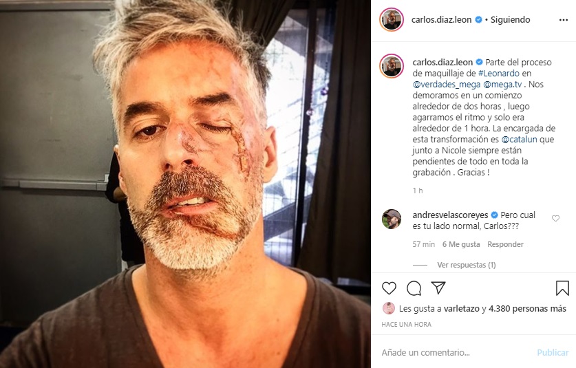 'Nos demoramos en un comienzo alrededor de dos horas, luego agarramos el ritmo y solo era alrededor de 1 hora. La encargada de esta transformación es @catalun que junto a Nicole siempre están pendientes de todo en toda la grabación. Gracias!', agregó el actor.