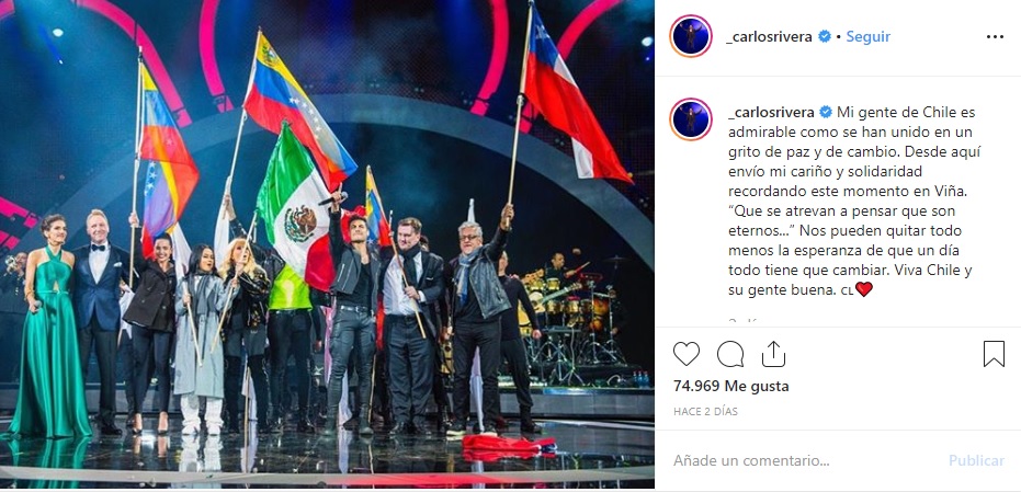 "Mi gente de Chile es admirable como se han unido en un grito de paz y de cambio. Desde aquí envío mi cariño y solidaridad recordando este momento en Viña. 'Que se atrevan a pensar que son eternos...' Nos pueden quitar todo menos la esperanza de que un día todo tenga que cambiar. Viva Chile y su gente buena", escribió el intérprete de "Recuérdame".