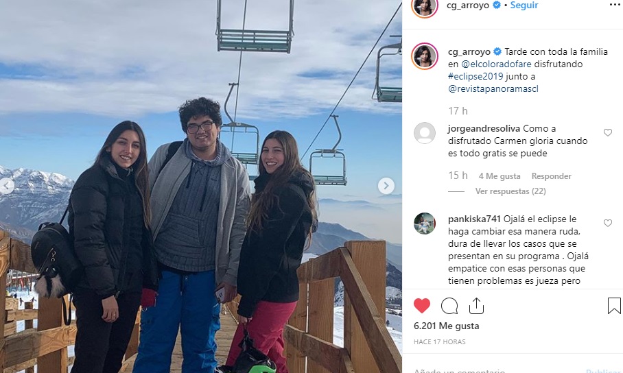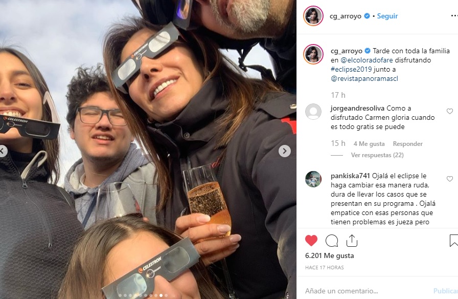 Carmen Gloria fue a las montañas con su pareja, Bernardo Borgeat y sus tres hijso. “Este es un evento nacional que, más allá del interés científico que despierta, genera un interés popular y es un recuerdo de vida que uno tiene. Por eso quise pasarlo acá, con toda mi familia”, dijo en sus historias de Instagram.