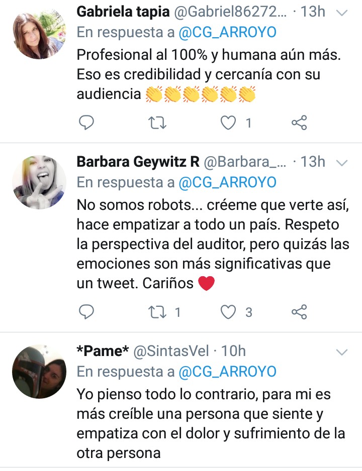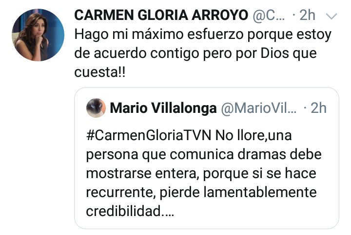 Sin embargo, sus seguidores se manifestaron contra el tuitero, señalando que es mucho mejor que Carmen Gloria Arroyo exprese sus sentimientos y se muestre tal cual.