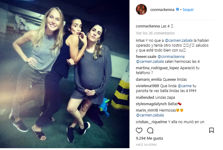 Su amiga Constanza Mackenna quiso compartir en su cuenta de Instagram, una fotografía con las actrices Simona Mardones y con Carmen Zabala, quien luce su avanzado embarazo.