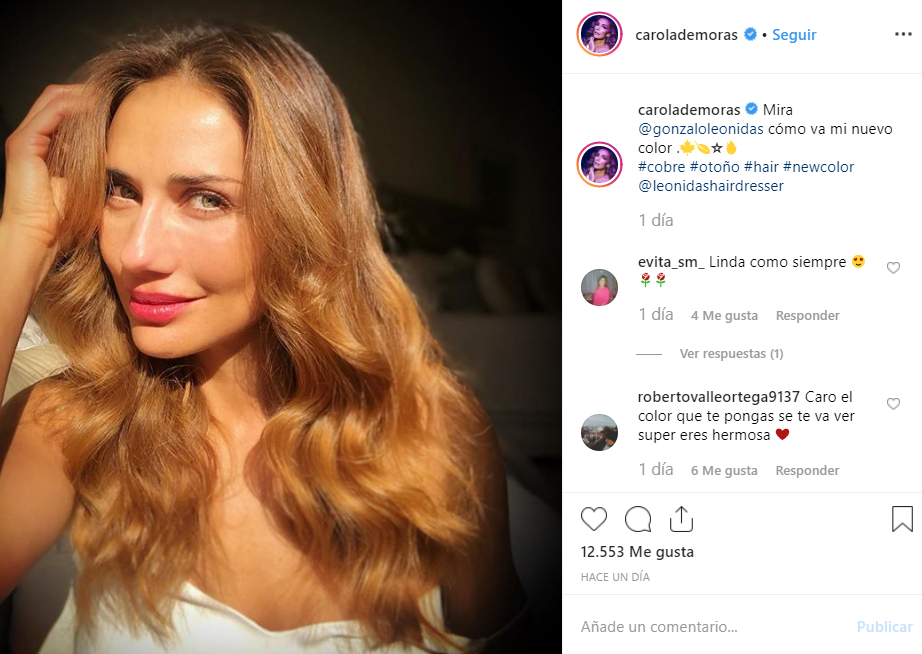 En la foto, Carola de Moras escribió “Mira @gonzaloleonidas cómo va mi nuevo color .#cobre #otoño #hair #newcolor @leonidashairdresser”. En la imagen aparece con su pelo mucho más claro de lo visto hasta ahora.