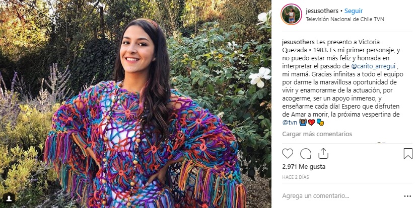 “Les presento a Victoria Quezada. Es mi primer personaje, y no puedo estar más feliz y honrada en interpretar el pasado de Carolina Arregui, mi mamá. Gracias infinitas a todo el equipo por darme la maravillosa oportunidad de vivir y enamorarme de la actuación, por acogerme, ser un apoyo inmenso, y enseñarme cada día. Espero que disfruten de ‘Amar a morir’, la próxima vespertina de TVN”, escribió María Jesús para acompañar una imagen del personaje que publicó en su cuenta de Instagram.