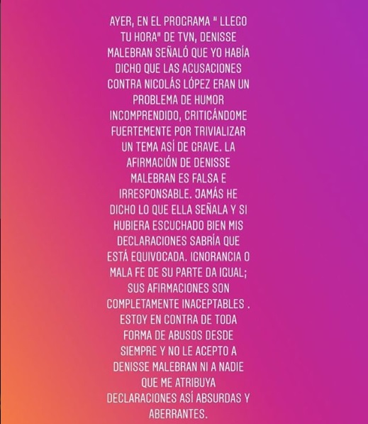 Carolina de Moras se desahogó a través de su cuenta en Instagram, luego de que en el programa "Llegó tu hora", exhibido este miércoles en TVN, Denise Malebrán se refiriera a los dichos de la animadora como una defensa a Nicolás López.