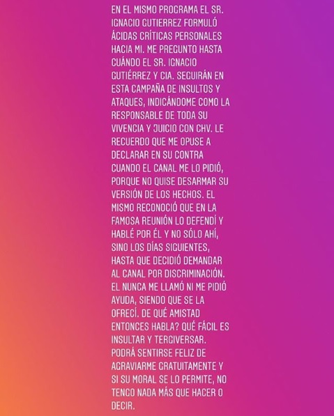 Sin embargo, su descargo más ferviente fue contra su ex compañero Ignacio Gutiérrez, el invitado del programa, quien reveló entre otras cosas que "no la quiero cerca de mí ni hoy, ni mañana, ni nunca". Esto, a raíz del pasivo actuar que Carolina habría tenido ante la denuncia de Nacho por discriminación que realizó contra CHV.