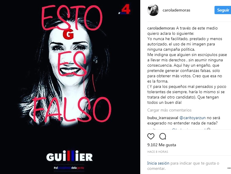 A través de su cuenta de Instagram, una foto de ella misma, como rostro de una de las campañas presidenciales, la que la modelo denunció como falsa: "A través de este medio quiero aclara lo siguiente: Yo nunca he facilitado, prestado y menos autorizado, el uso de mi imagen para ninguna campaña política", señala.