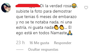 La usuaria le dijo: "Di la verdad rosa, subiste la foto para demostrar que tenías 6 meses de embarazo y no se te notaba nada, ni una estría, ni guata nada… El ego está en todos, Namaste".