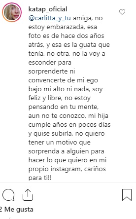 Ante esto, la ex 'Yingo' no dudó en responderle. "Amiga, no estoy embarazada, esa foto es de hace dos años atrás, y esa es la guata que tenía, no otra, no la voy a esconder para sorprenderte ni convencerte de mi ego bajo mi alto ni nada, soy feliz y libre, no estoy pensando en tu mente, aun no te conozco, mi hija cumple años en pocos días y quise subirla, no quiero tener un motivo que sorprenda a alguien para hacer lo que quiero en mi propio instagram, cariños para ti!!", dijo.