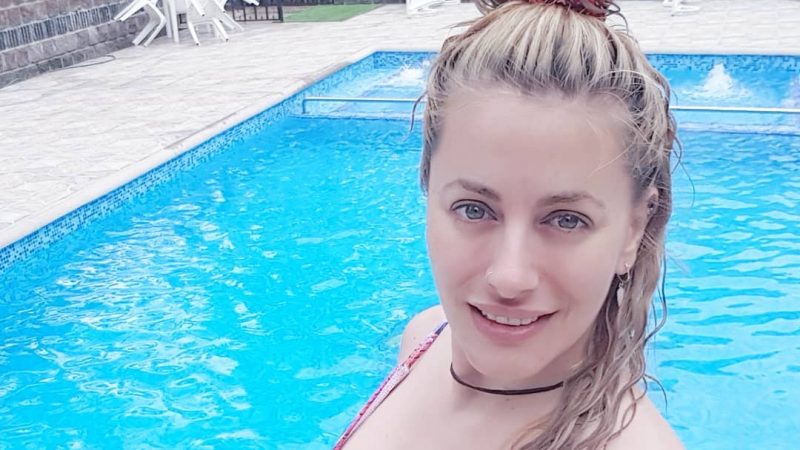 Mientras que en la segunda imagen, aparece disfrutando del agua con un traje de baño completo con un estampado de colores rosados, morados y amarillos.