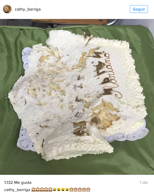 Entre baile y baile se cayó, nada menos que, encima de la torta cumpleañera. Cathy compartió en su Instagram imágenes de cómo quedó ella y la torta tras la caída.