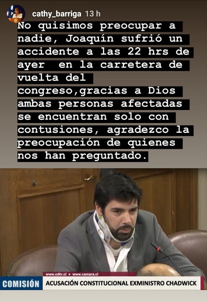 'No quisimos preocupar a nadie. Joaquín sufrió un accidente a las 22 hrs de ayer en la carretera de vuelta del Congreso. Gracias a Dios ambas personas afectadas se encuentran solo con contusiones. Agradezco la preocupación de quienes nos han preguntado', publicó Barriga vía Instagram Stories.