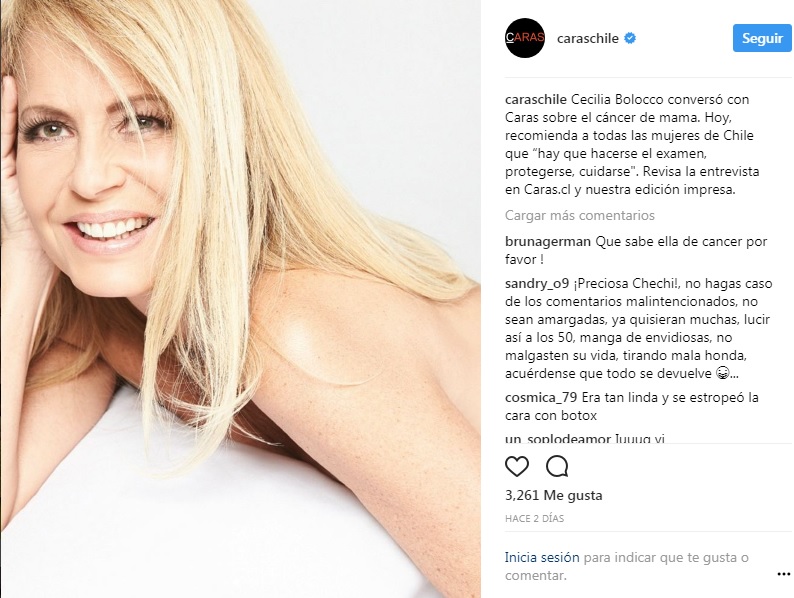La ex reina de belleza, posó para las cámaras de la revista Caras Chile, donde además habla del historial de cáncer presente en su familia por tres generaciones: "Es esencial aprender a amar la vida, a honrar tu existencia, a alimentar tu alma. Cuando estás en armonía es muy difícil que te enfermes", se confiesa Cecilia Bolocco.