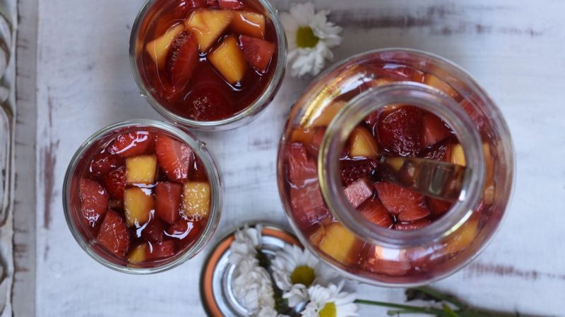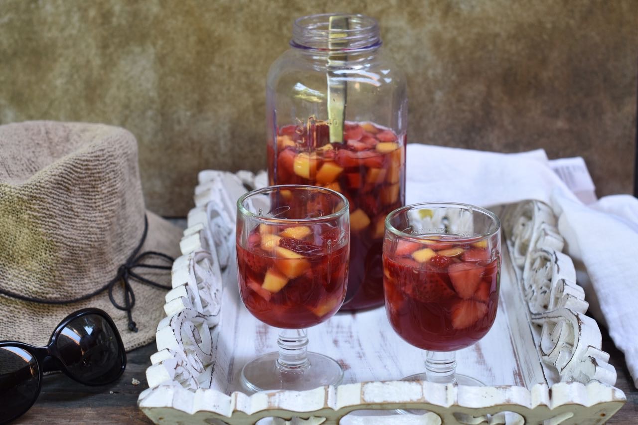 2.- Una vez frío, sacar las bolsas, estrujándolas muy bien. Juntar la mezcla anterior con el vino blanco o rosé, jugo de naranjas, almíbar y las frutas.