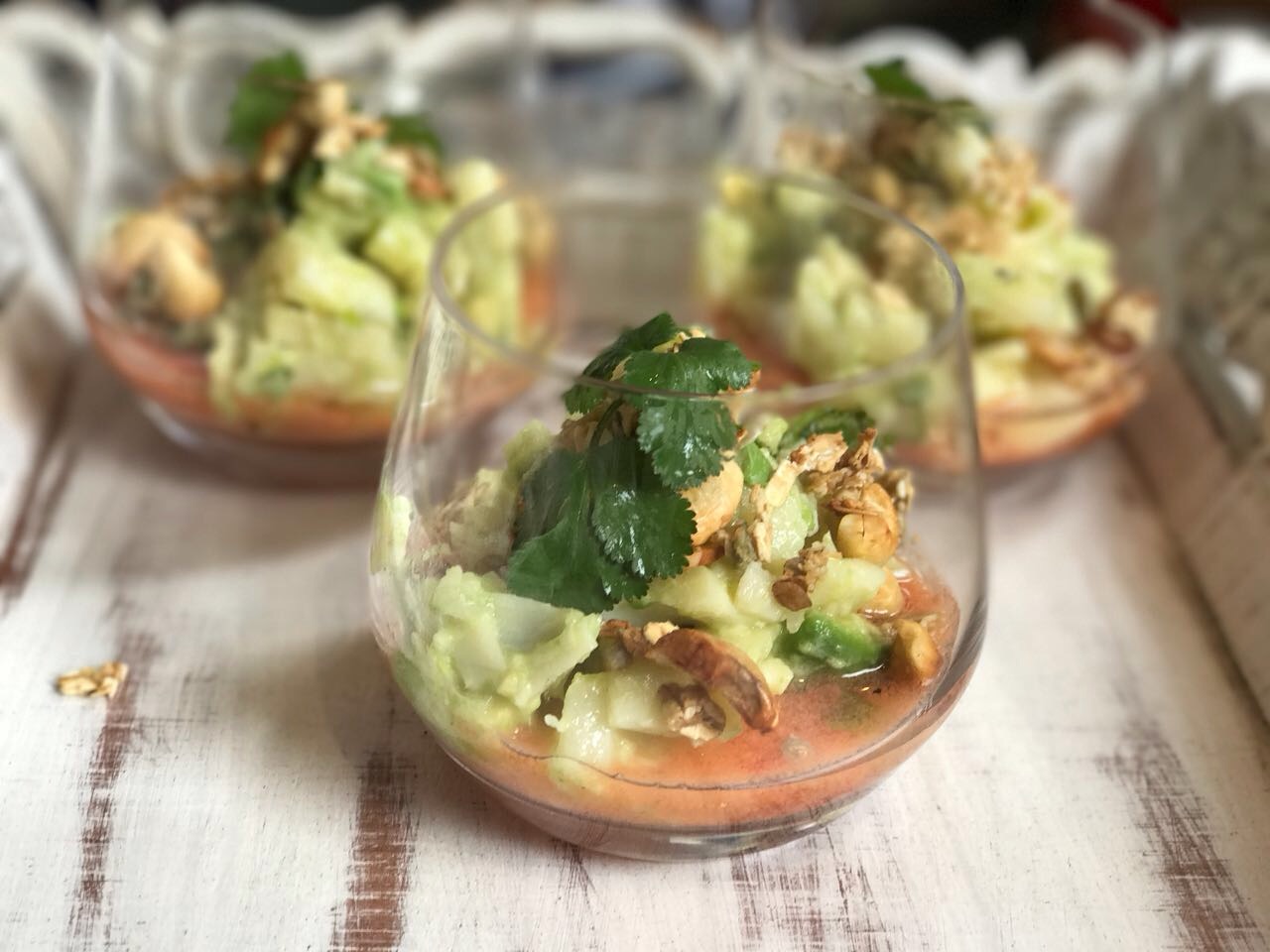 Puedes poner un poco de puré de tomates en el fondo de un vaso, luego el ceviche. Servir inmediatamente. Pueden espolvorear con algún fruto seco tostado o servir con tostadas de pan pita.