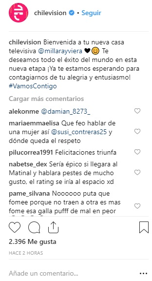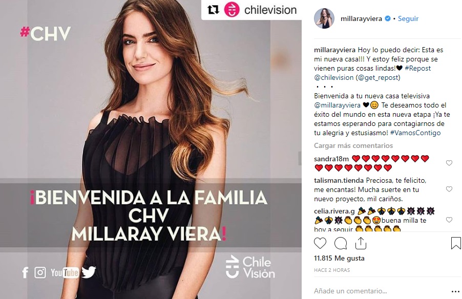 “A partir de 2019 la animadora Millaray Viera pasará a ser parte del equipo de Chilevisión, donde se desempeñará como conductora del programa de entretención de los fines de semana, Sabingo, entre otros proyectos”, anunció la señal.