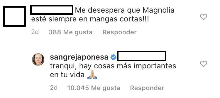 Suárez compartió una serie de fotos donde aparece con sus dos hijas, Rufina y Magnolia haciendo un picnic en el jardín de su hogar. Ahí, recibió el comentario "Me desespera que Magnolia esté siempre en mangas cortas!!!", ante lo que China respondió de forma irónica: "Tranqui, hay cosas más importantes en tu vida".
