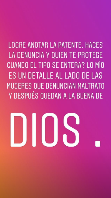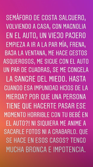 La actriz escribió también que no fue capaz de grabar ni sacar fotos al hombre, agregando que no fue capaz. Lo que sí hizo fue anotar la patente del auto. Sin embargo hizo un crítica a la poca protección que sufren las mujeres en estos casos.