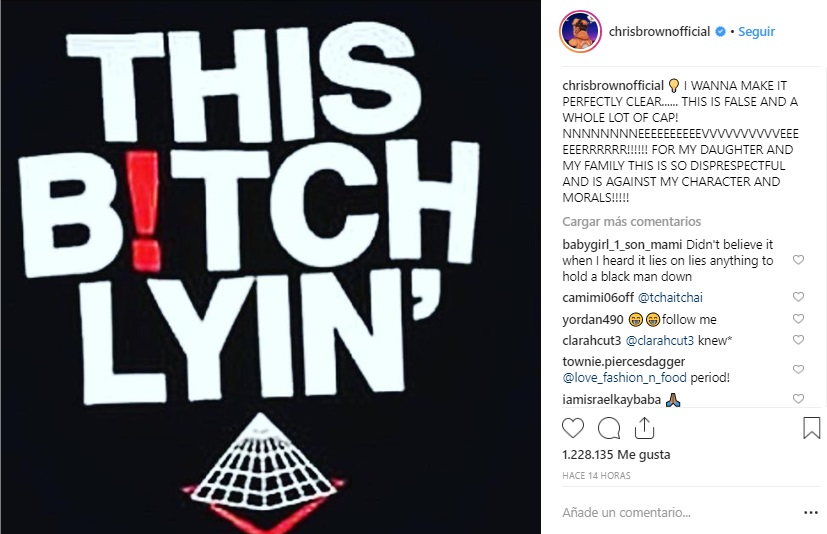 "Esa perra está mintiendo. Quiero dejarlo perfectamente claro... esto es falso y un montón de mierda! Nunca por mi hija y mi familia, esto es tan irrespetuoso y va en contra de mi carácter y mi moral", escribió Chris Brown.