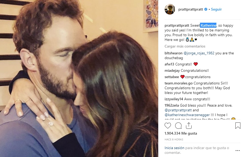 Con una emotiva fotos de ambos, Chris publicó la noticia en su cuenta de Instagram, donde además escribió "Dulce Katherine, estoy tan feliz de que hayas dicho que sí. Estoy tan emocionado de casarme contigo. Y orgulloso de vivir firmemente en la fe contigo. ¡Allá vamos!"