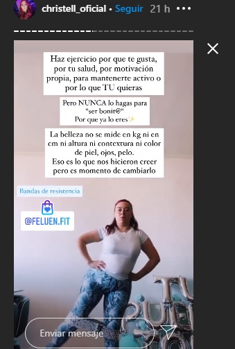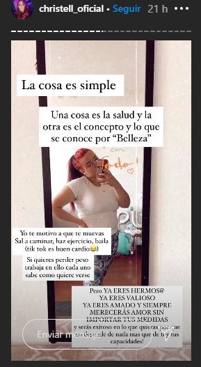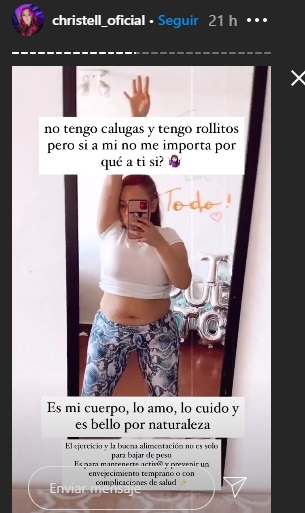 La idea de Christell al compartir estos registros es para que sus seguidores reflexionen sobre esas inseguridades que se tienen por el físico, por aquellos que padecen trastornos alimenticios.
