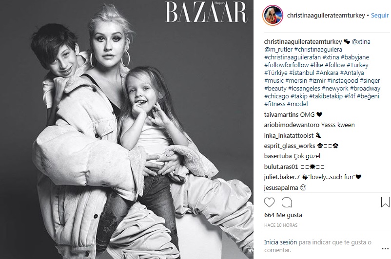 Ahora la cantante posó públicamente junto a sus 2 hijos de 10 y 3 años, para la próxima edición de la revista Haper's Bazaar. "Adoro ser una mamá osa y darles apoyo, transmitirles fuerza y un refugio seguro a mis niños y a mis seres queridos sabiendo que, por encima de todo lo demás, este es el trabajo más importante que desempeño", señaló Aguilera en la reciente entrevista con la mencionada revista.