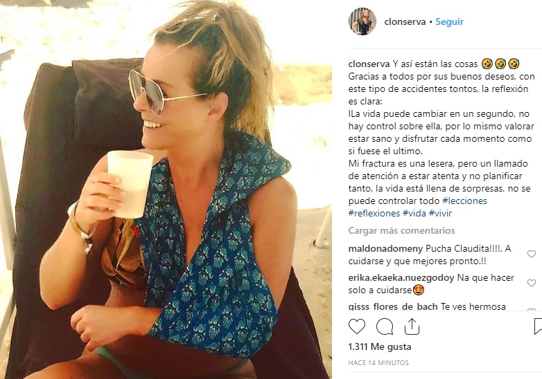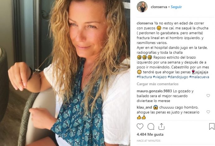 “Ya no estoy en edad de correr con zuecos Me caí, me saqué la chucha (perdonen lo garabatera, pero amerita). Fractura lineal en el hombro izquierdo, y rasmillones varios. Ayer en el hospital dando jugo en la tarde, radiografías y toda la challa. Reposo estricto del brazo izquierdo por una semana y después de a poco ir moviéndolo. Cabestrillo por un mes tendré que ahogar las penas jajajaja”, dijo la animadora, tratando de tomarse la situación de manera cómica.