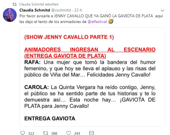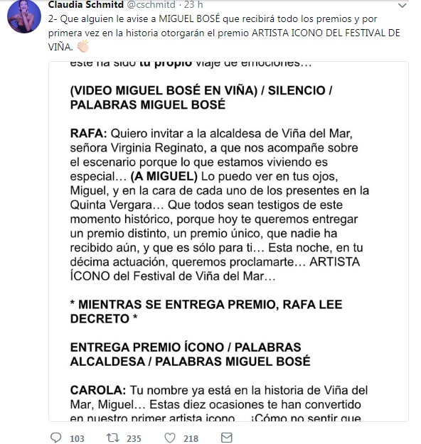 Según las publicaciones de la uruguaya, humorista Jenny Cavallo, se llevaría una Gaviota de Plata, mientras que Miguel Bosé, recibirá todos los premios además del premio Artista Ícono del Festival de Viña del Mar.