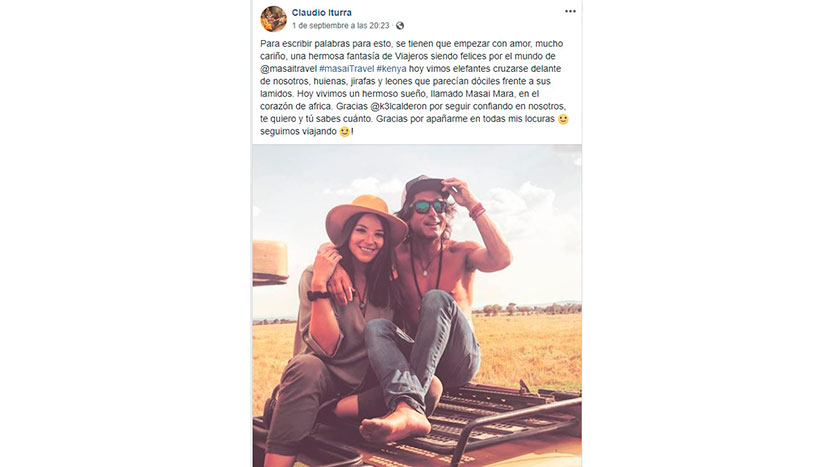El post fue publicado el 1 de septiembre por Iturra que decía: "Para escribir palabras para esto, se tienen que empezar con amor, mucho cariño, una hermosa fantasía de viajeros siendo felices por el mundo @masaitravel #masaitravel #kenya hoy vimos elefantes cruzarse delante de nosotros, hienas, jirafas y leones que parecían dóciles frente a sus lamidos. Hoy vimos un hermoso sueño, llamado Masai Mara, en el corazón de África. Gracias @k3lcalderon por seguir confiando en nosotros, te quiero y tú sabes cuánto. Gracias por apañarme en todas mis locuras, seguimos viajando!".