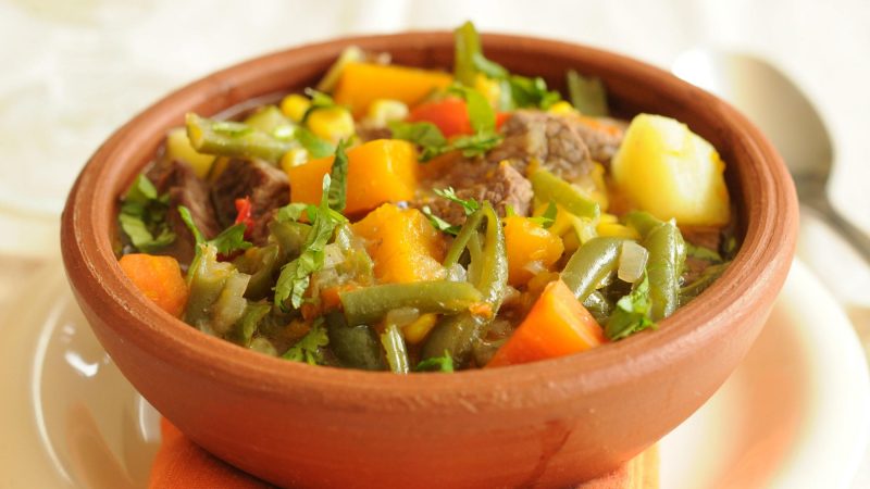 Primero, tienes que poner a freír una cebolla y ajo picados finitos con una pizca de orégano. Cuando la cebolla empiece a ponerse translúcida, agregas la carne picada, lo revuelves unos minutos y después añades papas medianas en cubitos, zapallo en cubos, zanahoria picada fina, choclo, porotos verdes y el ají de color.
