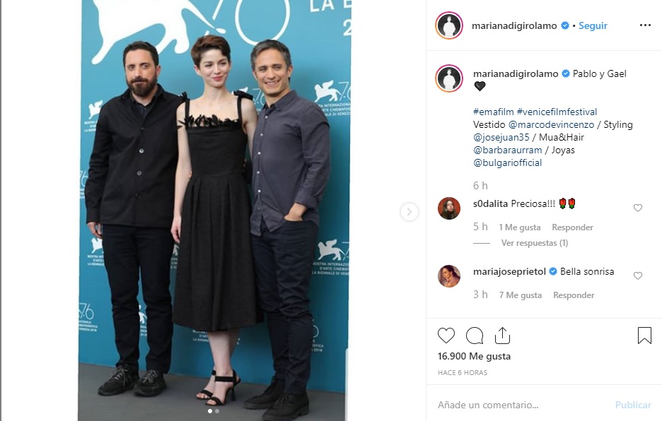 Mariana además compartió otra imagen de su paso por el Festival de Venecia donde posa con su compañero de elenco, Gael García Bernal y el director de "Ema", Pablo Larraín. En esta postal muestra otro de los looks que lució en el evento, un delicado vestido negro de Marco de Vincenzo.