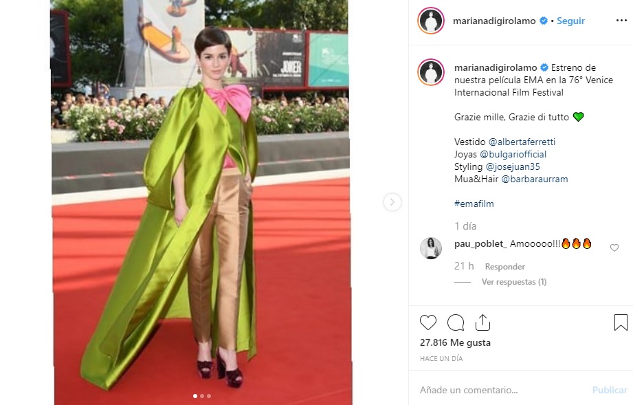 "Estreno de nuestra película EMA en la 76° Venice Internacional Film Festival. Grazie mille, Grazie di tutto (Mil gracias, gracias de corazón)", escribió en la publicación donde muestra su look. Di Girolamo luce un colorido atuendo de Alberta Ferretti compuesto por pantalón, capa y blusa en tonos beige, verde y rosa.