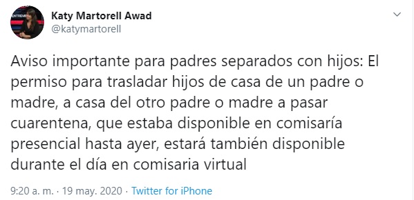 "El permiso para trasladar hijos de la casa de un padre o madre, a la casa del otro padre o madre a pasar cuarentena, que solo estaba disponible en comisaría presencial hasta ayer, ahora se puede pedir también en comisaría virtual", aclaró la autoridad en Twitter.