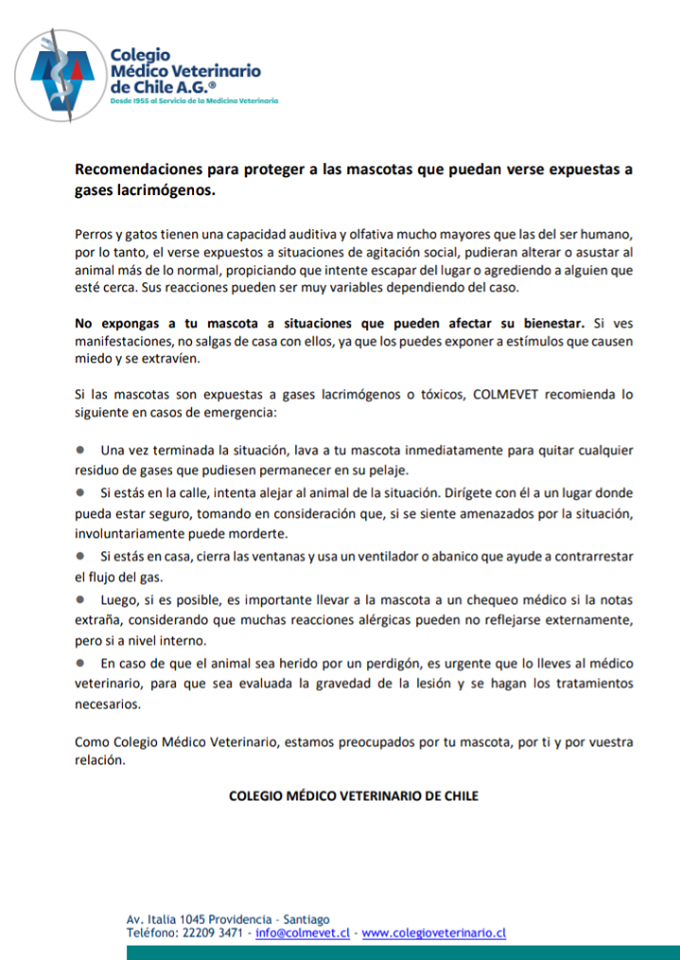 En ese contexto, en redes sociales han hecho un llamado a cuidar a los perros y gatos que se puedan encontrar en las calles durante las protestas. El Colegio Médico Veterinario de Chile se sumó a esa iniciativa y entregó una serie de recomendaciones para proteger a los animales.