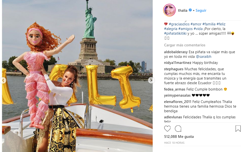 Una de las cosas que más llamó la atención en su celebración fue una piñata que recibió con la forma de la artista. La figura tiene el mismo traje que ella tiene en el video de #ThaliaChallenge y es bastante grande.