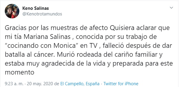 "Gracias por las muestras de afecto. Quisiera aclarar que mi tía Mariana Salinas , conocida por su trabajo de ‘Cocinando con Mónica’ en TV, falleció después de dar batalla al cáncer", partió escribiendo en sus redes sociales.