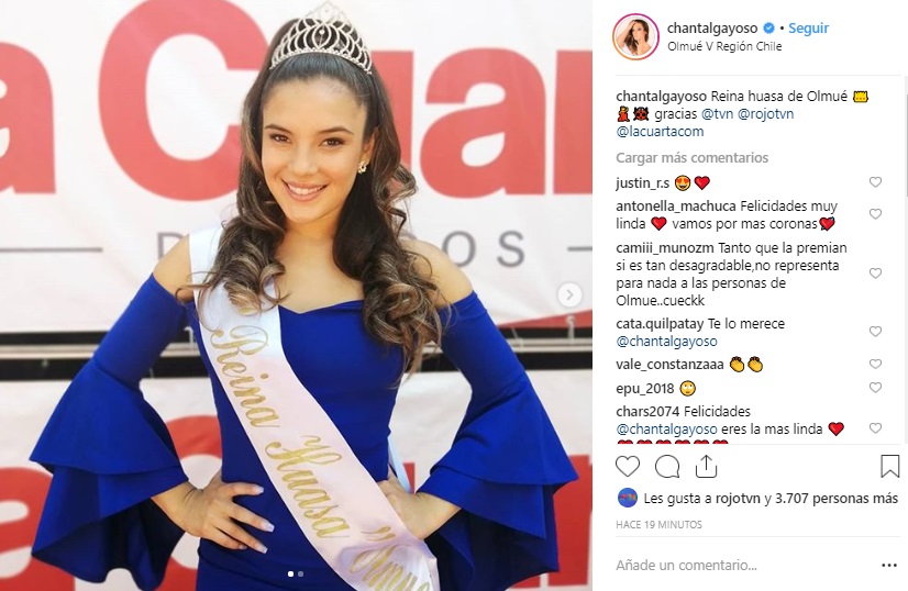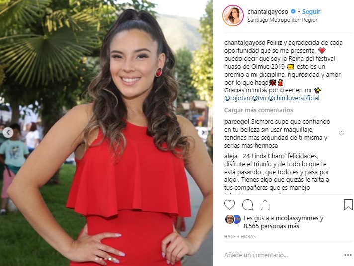 "Feliiiz y agradecida de cada oportunidad que se me presenta, puedo decir que soy la Reina del festival huaso de Olmué 2019. Esto es un premio a mi disciplina, rigurosidad y amor por lo que hago", escribió Chantal en su cuenta de Instagram.