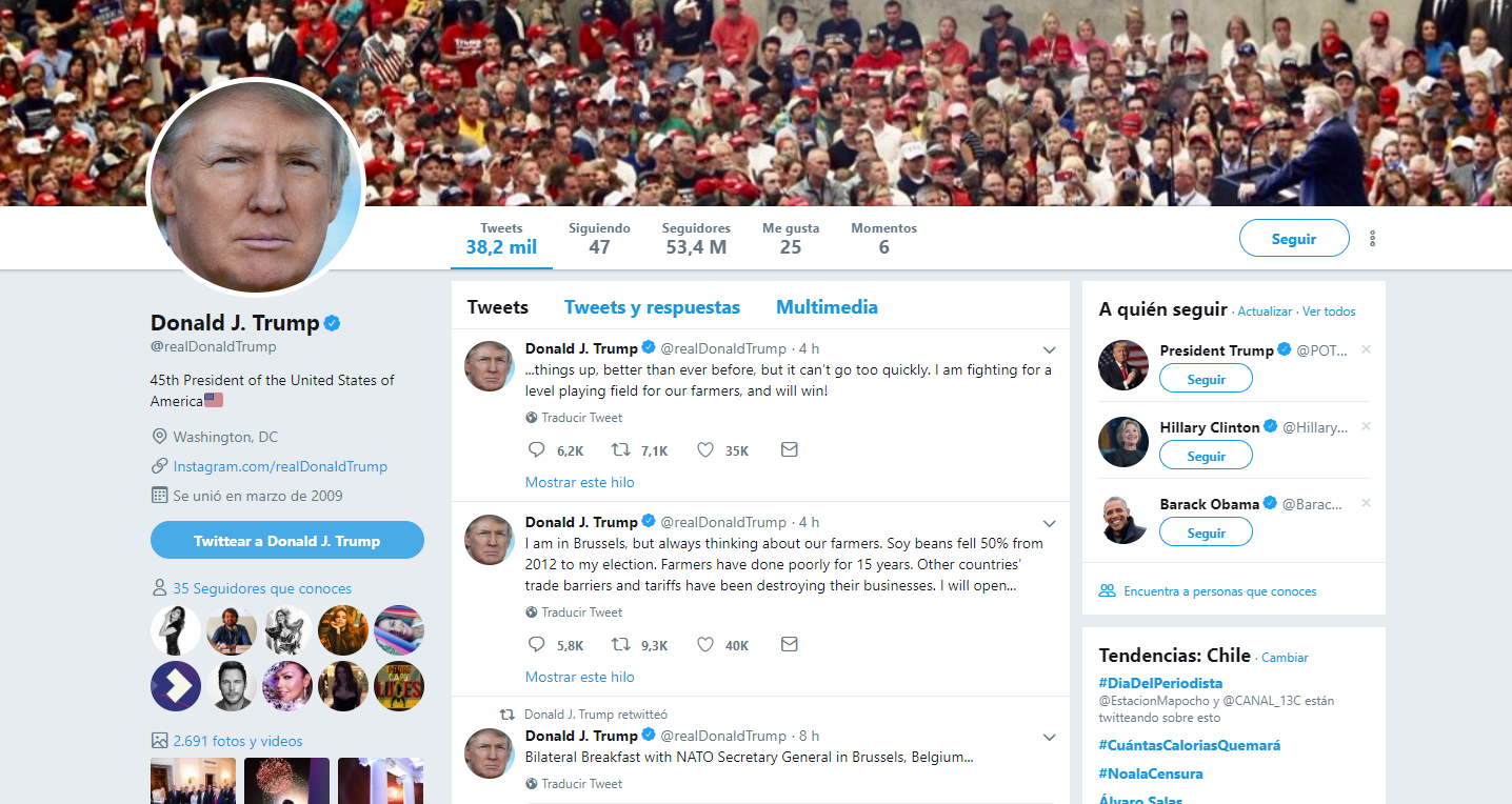 El mandatario tiene más de 53, 4 millones de seguidores en su cuenta @realDonaldTrump. El doble de lo que tenía cuando asumió el poder a inicios de 2017.